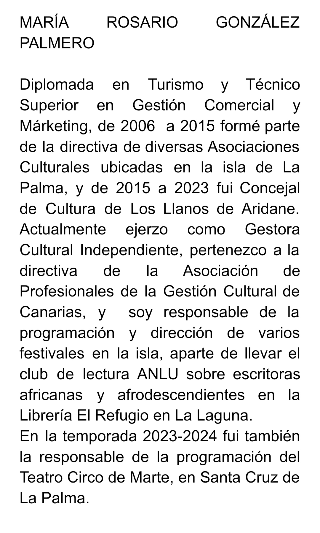 Premio Cygnus de Cine Solidario y Valores 2022 otorgado por la Universidad de Alcalá (UAH), junto con la Asociación de Productores y Distribuidores de Cine Solidario y Valores (ACIVAS), por no dejar de impulsar la cultura y la importancia de ésta, poniéndola en valor, no solo durante la pandemia, sino también durante la erupción del volcán Tajogaite. Como gestora cultural independiente, en los dos últimos años, y bajo la marca Ars Vita: Programación, dirección y producción de los festivales y ciclos 'La Tecla de la Capital' y 'Una Ciudad en Danza' y FAVE en Santa Cruz de La Palma; 'A lo Rural' en El Paso y 'BonitaLab', de residencias artísticas en el eje sur-sur, en varios puntos de la isla. En nombre propio, llevo desde el mes de marzo de 2025, el club de lectura ANLU en la librería El Refugio en La Laguna, dedicado a las escritoras africanas y afrodescendientes.